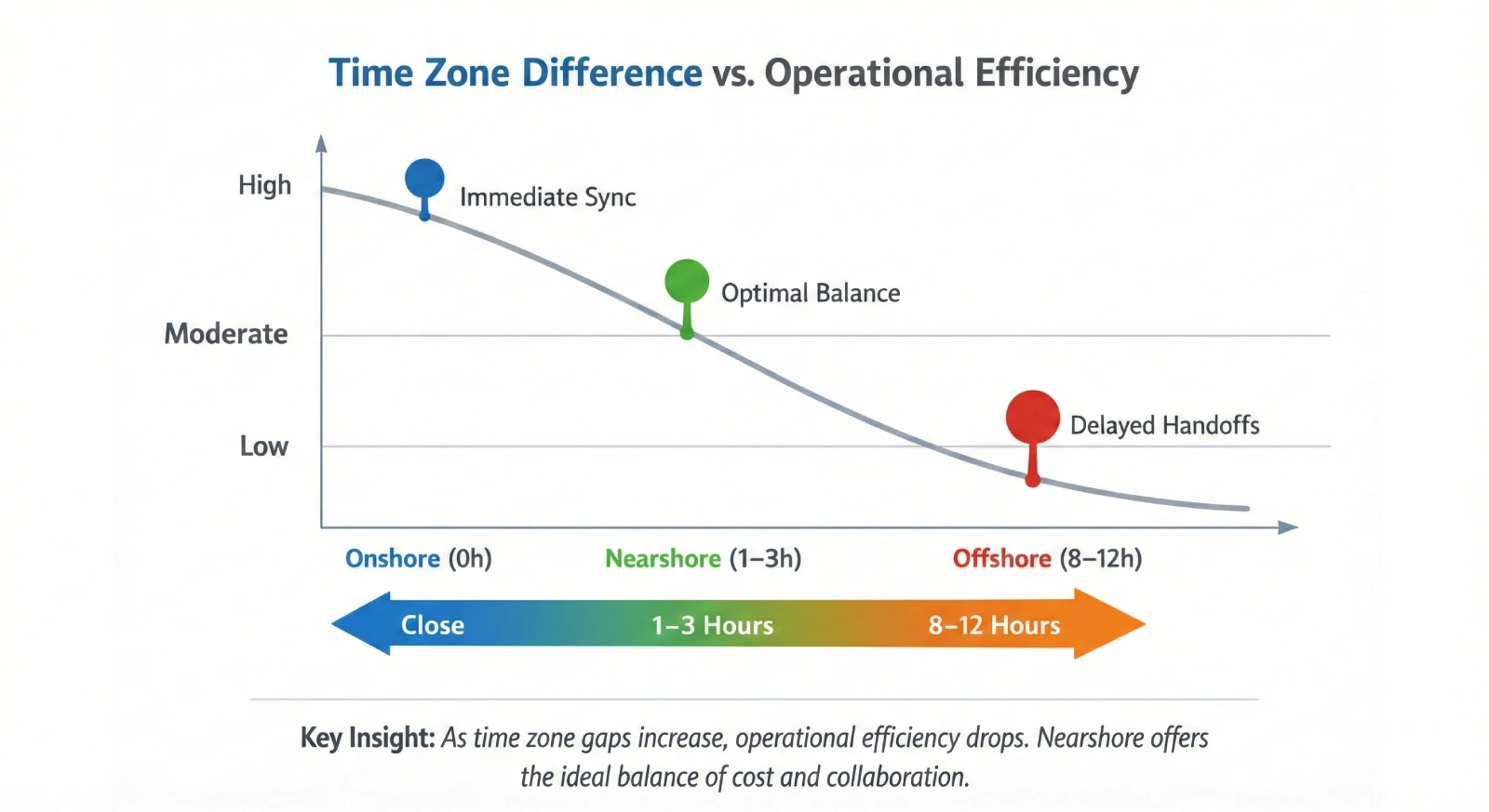 Nearshore balances cost efficiency with real-time collaboration, which is critical for agile teams shipping fast.